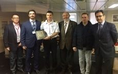 Para celebrar esta visita a Santander el presidente de la Autoridad Portuaria, Jaime González, y el responsable del departamento de carga industrial de UECC, José Antonio del Río, entregaron una placa conmemorativa al capitán del barco, Pavel Blokhin