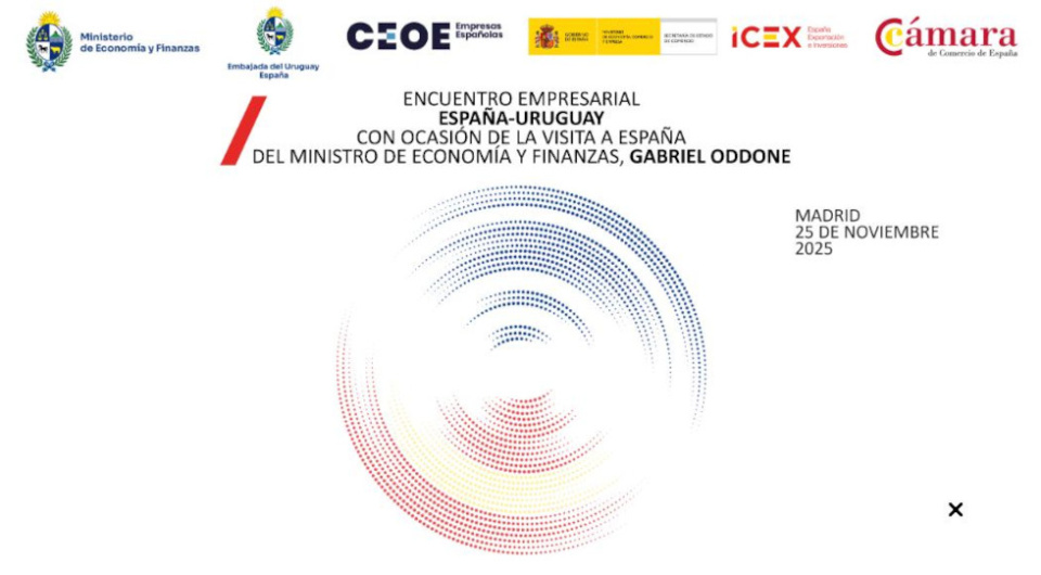 Con ocasión de la próxima visita de una delegación procedente de Uruguay, encabezada por el ministro de Economía y Finanzas, el Sr.Gabriel Oddone, la Cámara de Comercio de España, la Secretaría de Estado de Comercio, a través de ICEX España Exportación e Inversiones, y la Confederación Española de Organizaciones Empresariales (CEOE) organizan un Encuentro Empresarial España – Uruguay el próximo 25 de noviembre a las 17:00 horas en la Cámara de Comercio de España (Calle de la Ribera del Loira 12, 28042 - Madrid).