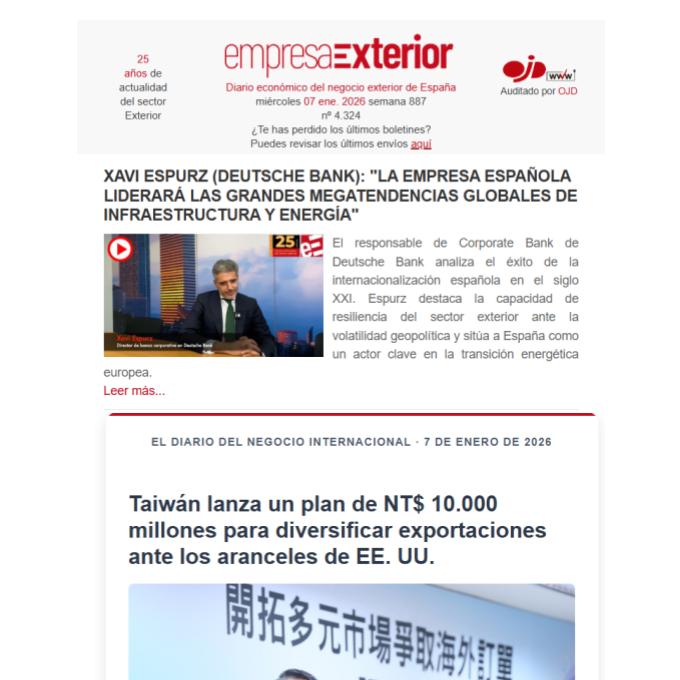 Boletín informativo diario de noticias del negocio y comercio exterior de España con el resumen de lo más destacado del día.