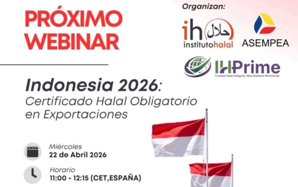 La Asociación Empresarial España-ASEAN (ASEMPEA), en colaboración con el Instituto Halal e Internacional Halal Prime Mohammad Zen Hafidz, celebrará el próximo 22 de abril de 2026 el webinar "Indonesia 2026: Certificado Halal Obligatorio en Exportaciones" para preparar a las empresas ante el cierre del mercado indonesio a productos no certificados.