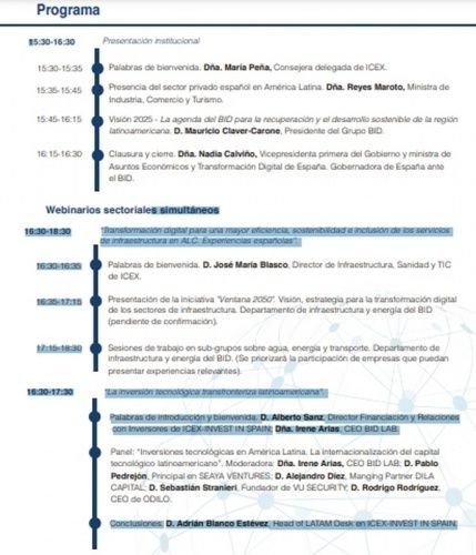 La presentación estará a cargo D. Mauricio Claver-Carone, Presidente del Grupo BID y contará asimismo con la participación de la Vicepresidenta Primera del Gobierno y Ministra de Asuntos Económicos y Transformación Digital de España, Dña. Nadia Calviño y con la Ministra de Industria, Comercio y Turismo de España, Dña. Reyes Maroto Illera.