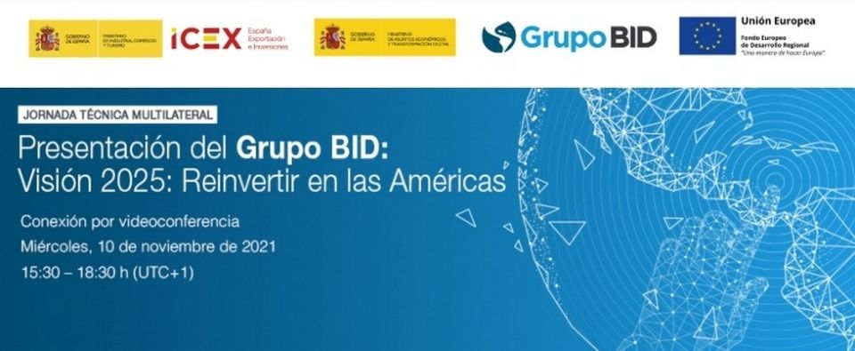 ICEX España Exportaciones e Inversiones, en colaboración con el Grupo del Banco Interamericano de Desarrollo, organiza para el día 10 de noviembre desde Madrid en formato online y gratuito, esta Jornada de presentación del Grupo BID y su agenda “Visión 2025” para la recuperación y el crecimiento económico sostenible en América Latina y el Caribe, dirigida a empresas españolas con interés en la región.