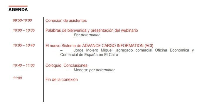 ICEX España Exportación e Inversiones junto con la Oficina Económica y Comercial de España en Egipto, organizan una sesión informativa con el fin de explicar a todas las empresas españolas que tengan previsto exportar al país o lo están haciendo ya el nuevo sistema de Advance Cargo Information (ACI).