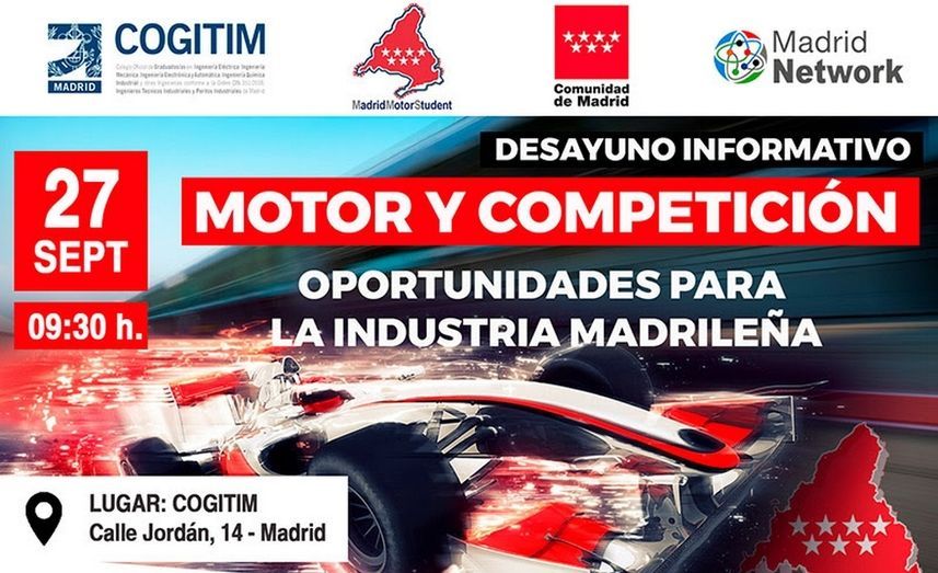 Madrid Network te invita al desayuno informativo Motor y competición: Oportunidades para la industria madrileña, coorganizado junto con el Colegio Oficial de Ingenieros Técnicos Industriales de Madrid, Comunidad de Madrid y Madrid Motor Student, el próximo 27 de septiembre a las 9:30 h. en la sede de COGITIM, Calle Jordán, 14 – Madrid.