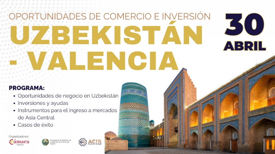 Organizado por ACIR Southern Europe, la Embajada de Uzbekistán en el Reino de España y la Cámara de Comercio de Valencia, este encuentro promete abrir las puertas a un mundo de posibilidades empresariales. Se desarrollará el próximo 30 de abril de 2024, desde las 11:00 horas CET.