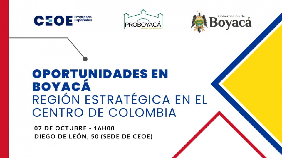 CEOE, ProBoyacá y la Gobernación de Boyacá (Colombia) invitan a participar en el foro empresarial «Oportunidades en Boyacá: región estratégica en el centro de Colombia», que se celebrará el próximo 7 de octubre a las 16:00 en CEOE (c/ Diego de León, 50, Madrid).