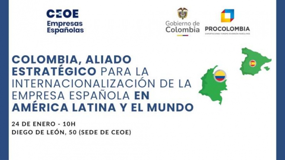 Con ocasión de la visita a España de la presidente de ProColombia, Sra. Carmen Caballero Villa, la Confederación Española de Organizaciones Empresariales (CEOE), en colaboración con la Embajada de Colombia y la Oficina de ProColombia en España, invitan a un Encuentro sobre Oportunidades de Negocios e Inversión en Colombia, que se celebrará el próximo 24 de enero, a las 10h00 en la sede de CEOE (calle Diego de León, 50, Madrid).